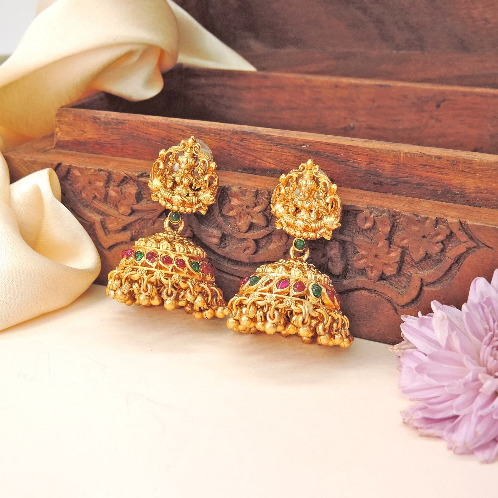 These antique temple-style jhumkas feature finely crafted Lakshmi motifs, adorned with ruby and emerald stones, and finished with golden bead drops. Perfect for temple ceremonies, weddings, and festive celebrations.