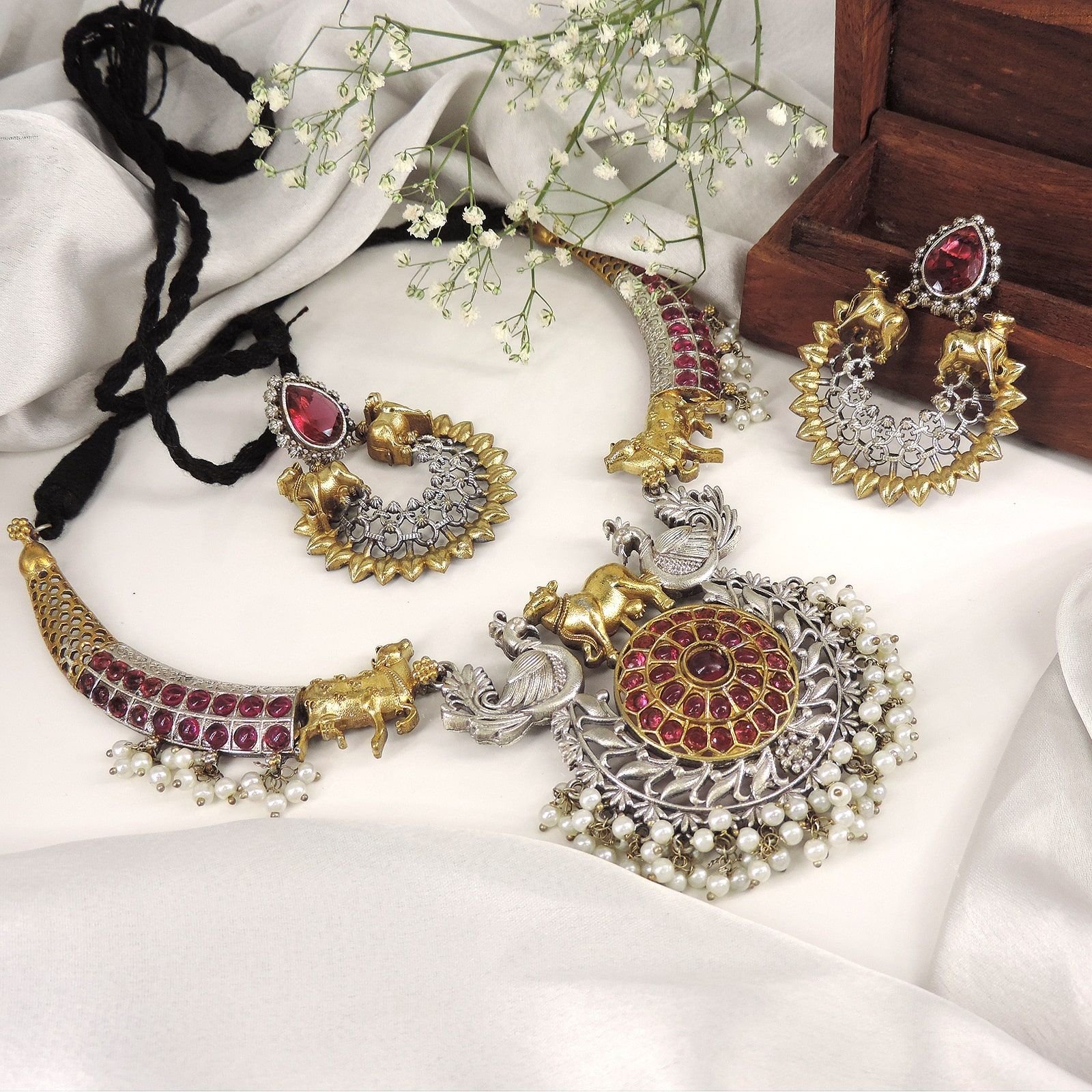 Turn heads with this majestic antique silver look-alike necklace set, adorned with red stones and detailed motifs of peacocks and elephants. The design is enriched with intricate carvings, pearl danglers, and dual-tone silver and gold plating for a regal touch. Complete with coordinated earrings, this jewelry set is ideal for weddings, festivals, and traditional celebrations, adding a royal elegance to any outfit.