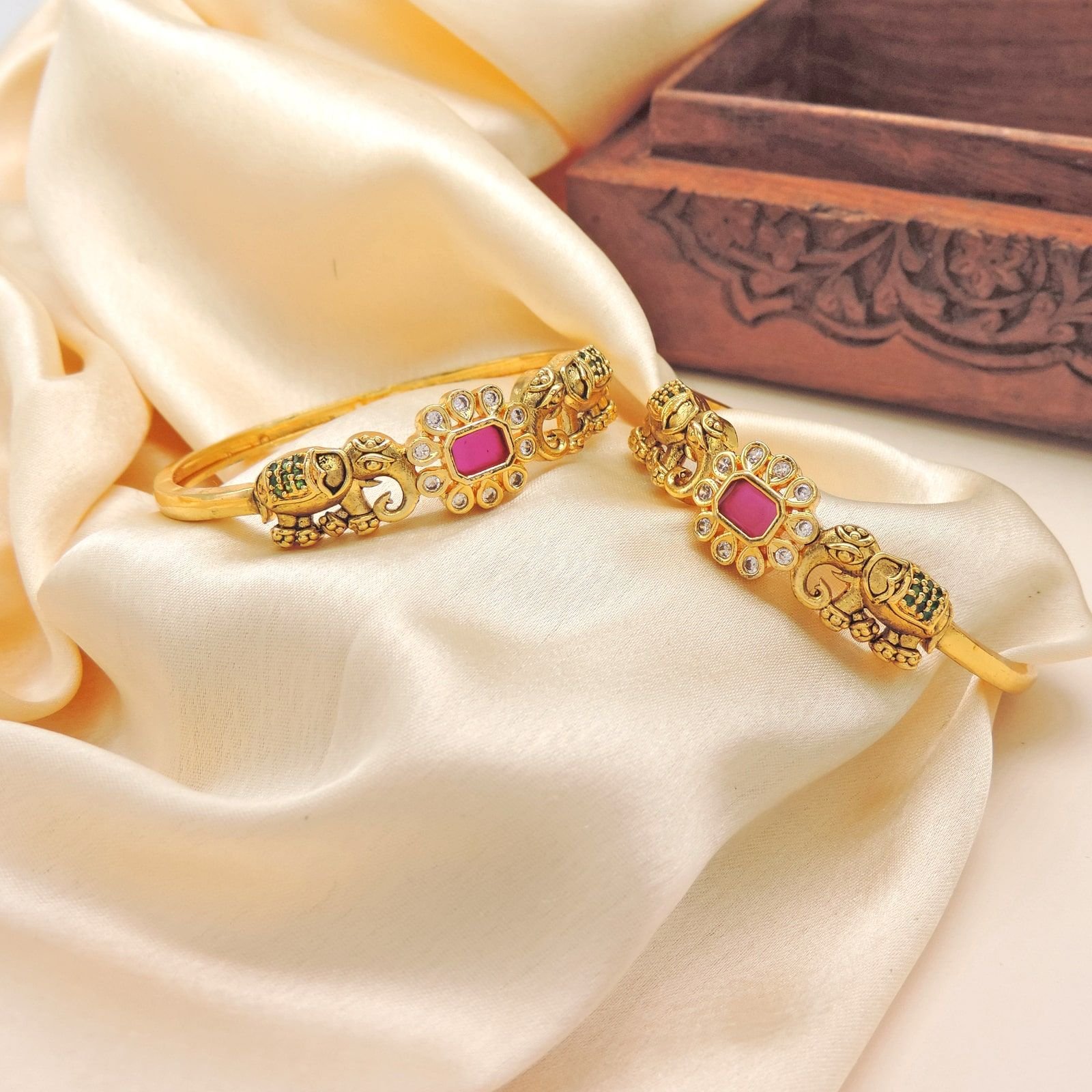 Antique gold-plated bangles with elephant motifs and ruby center stones.