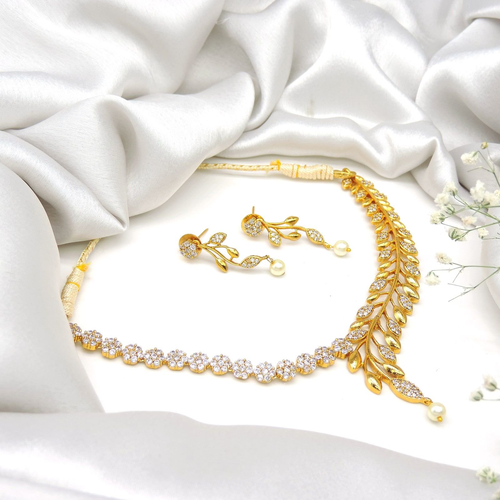 Floral-inspired choker necklace with diamond look stones and pearl drops, ideal for brides and festive wear.
