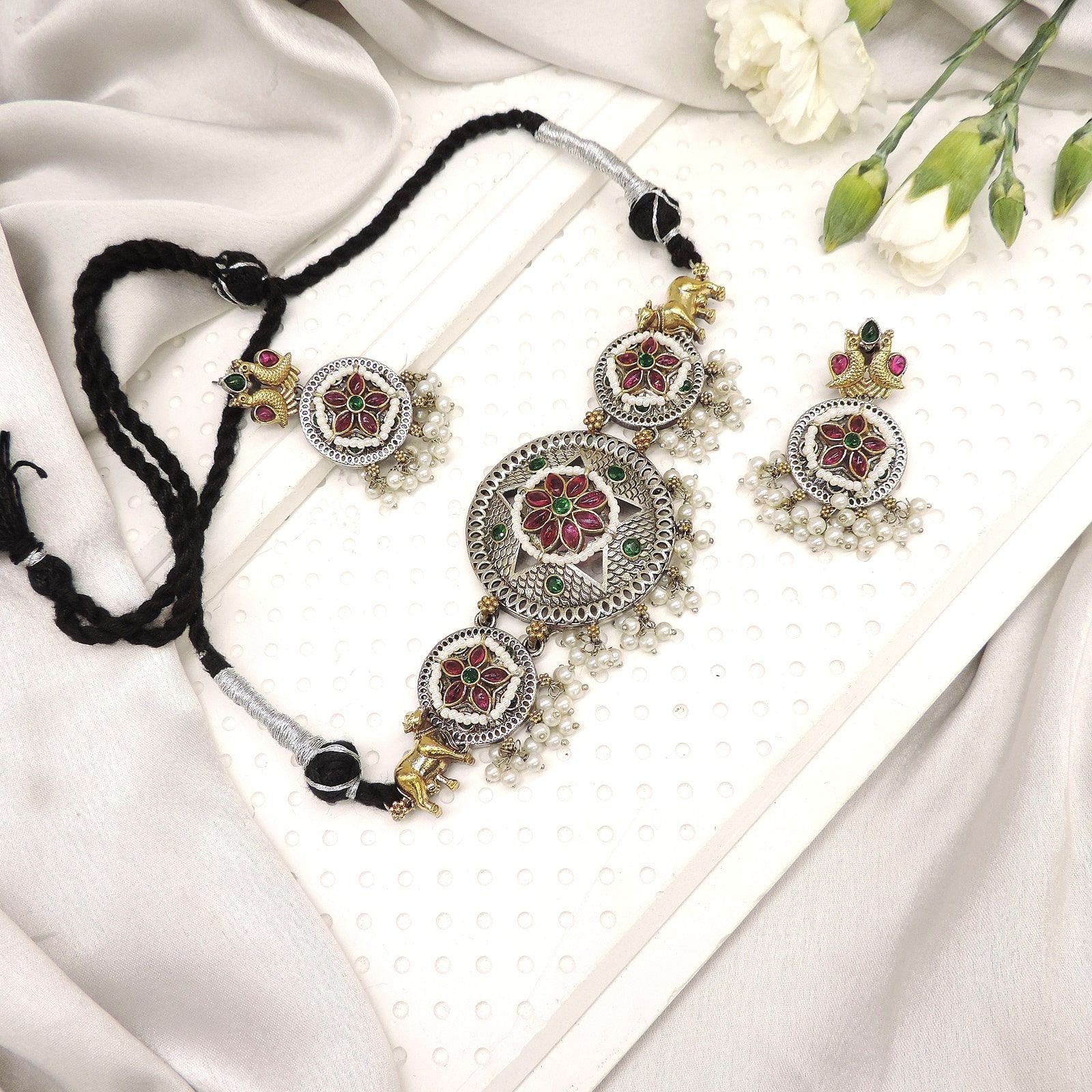 Add a royal touch to your ethnic attire with this oxidised silver look-alike choker set. Designed with intricate circular motifs, it features striking red and green enamel floral work enhanced with delicate pearl hangings. The matching earrings complete the set, making it a stunning choice for weddings, festive occasions, and traditional celebrations. Lightweight yet bold, this set blends classic Indian craftsmanship with modern elegance, making it a must-have in your jewelry collection.