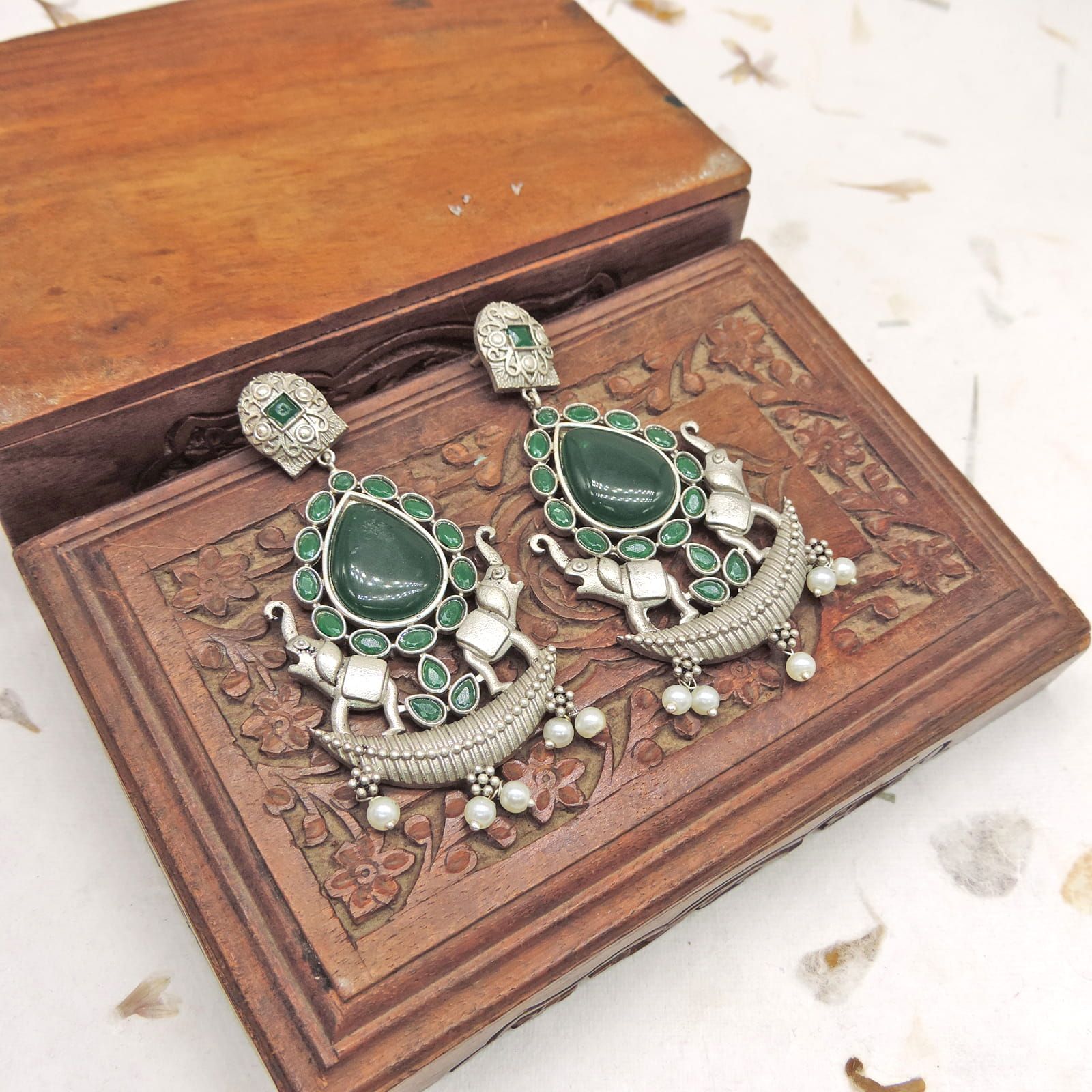 Green Stone Elephant Oxidized Statement Earrings with Pearl Drops