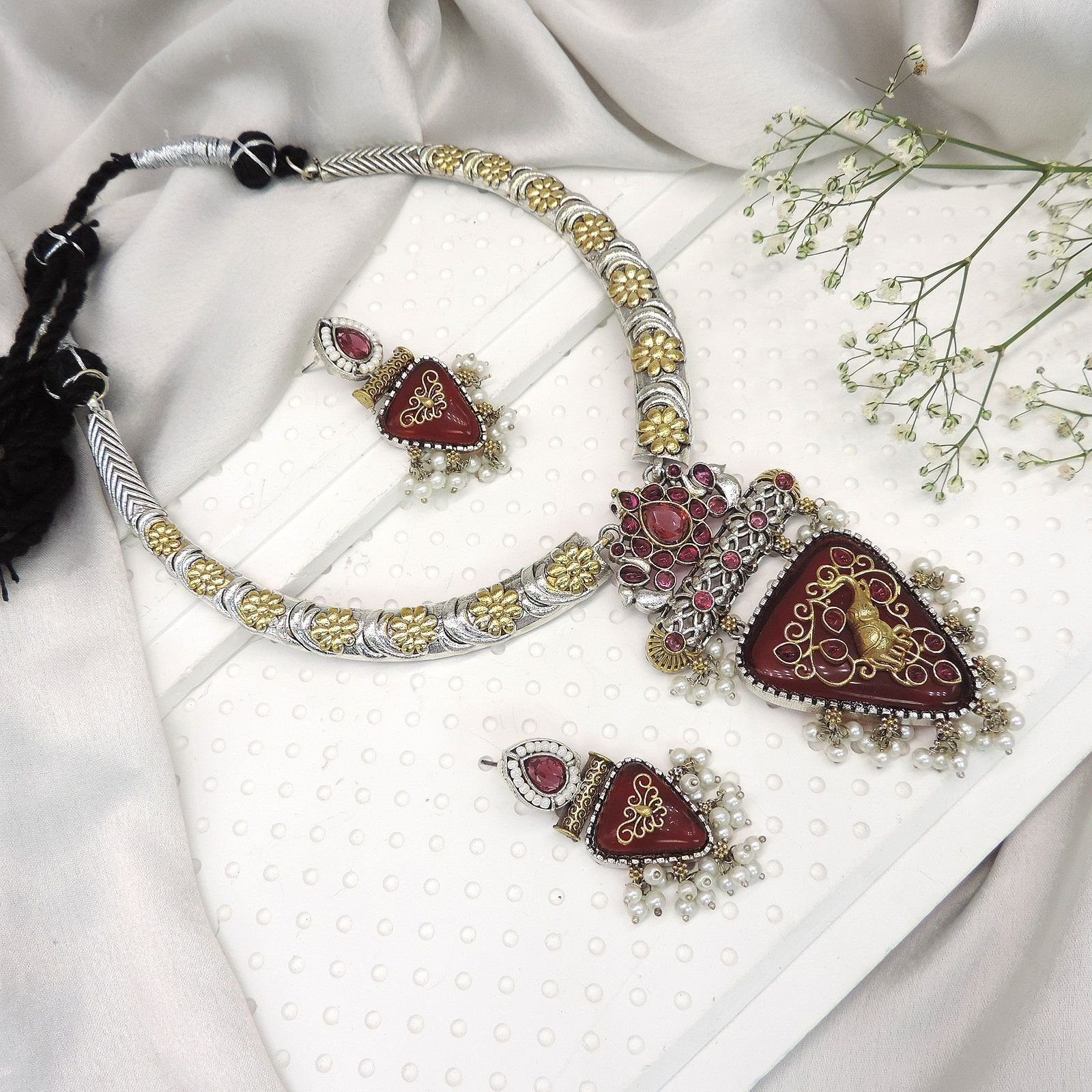 Oxidised silver-gold necklace set with triangular red stone pendants, pearl hangings, and matching earrings. Perfect for weddings, festive wear, and cultural occasions.