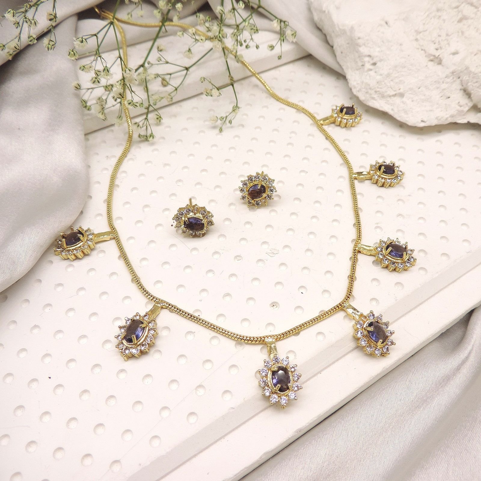 A delicate AD necklace set featuring purple stones surrounded by American Diamond crystals, paired with matching stud earrings. Perfect for elegant and festive looks.