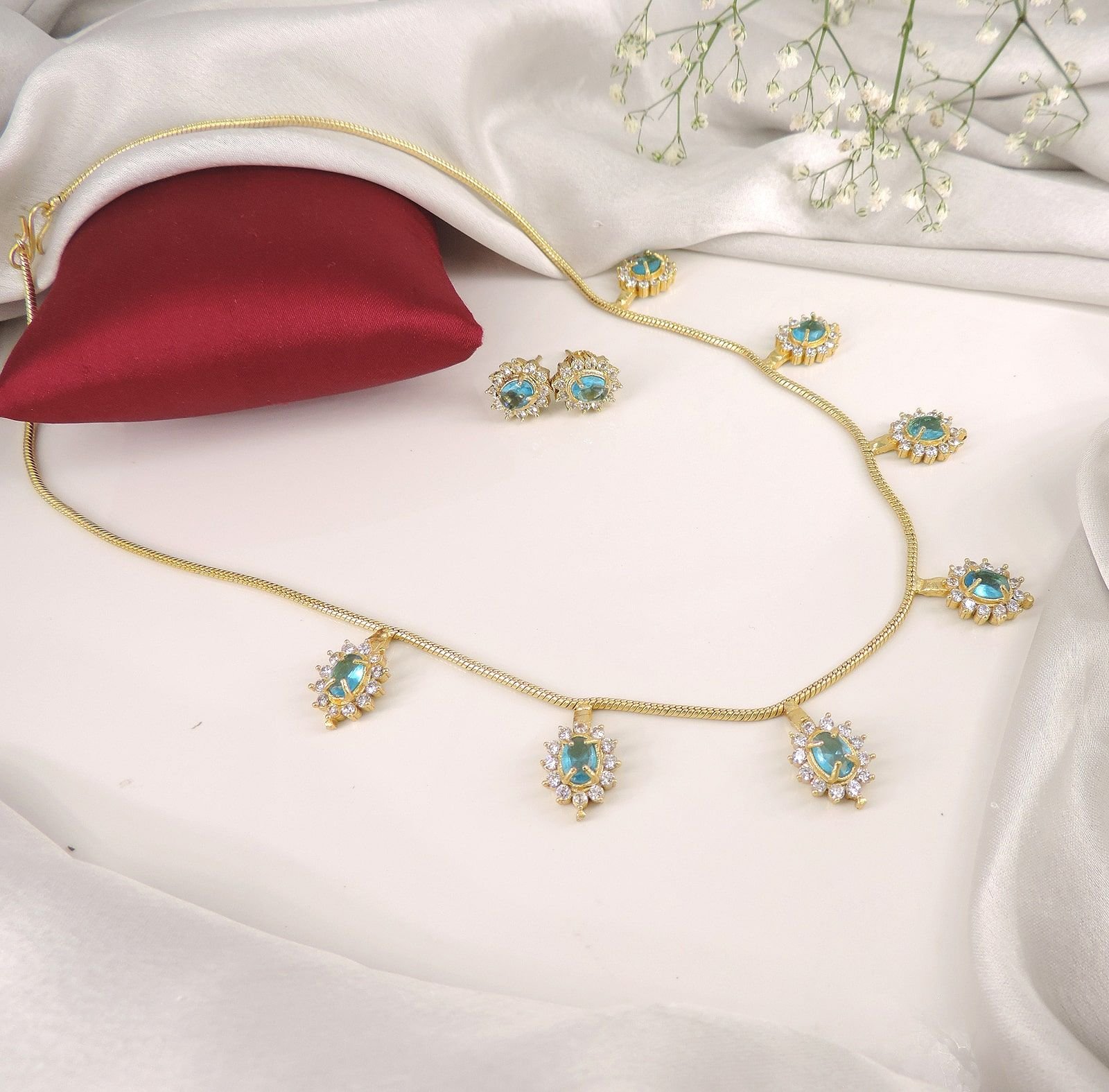 A delicate AD necklace set featuring oval blue stones framed by sparkling American Diamond crystals, paired with matching stud earrings. Perfect for festive and elegant looks.